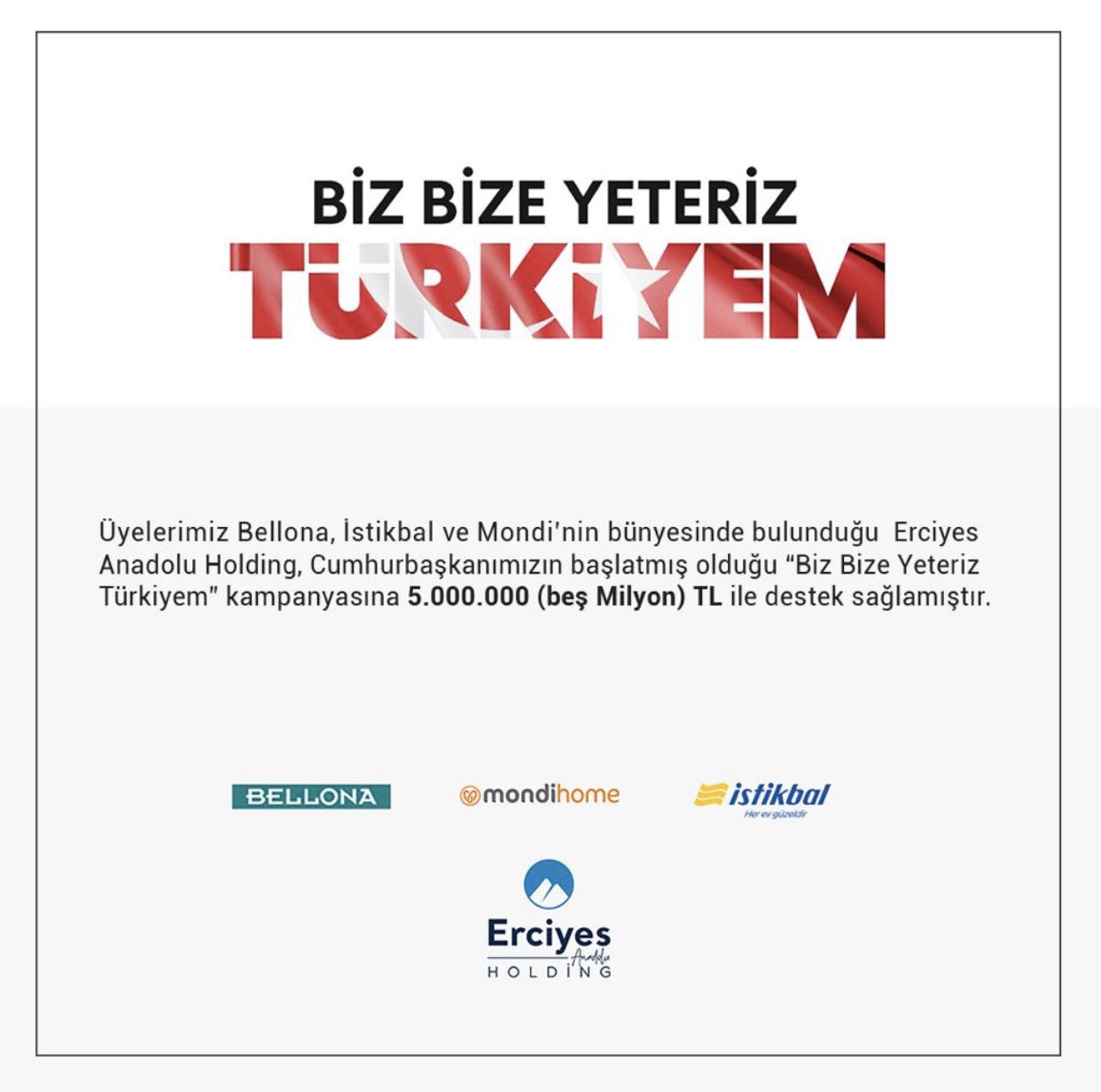 Mosder Pa Twitter Bizbizeyeterizturkiyem Uyelerimiz Bellona Istikbal Ve Mondi Nin Bunyesinde Bulundugu Erciyes Anadolu Holding Cumhurbaskanimizin Baslatmis Oldugu Biz Bize Yeteriz Turkiyem Kampanyasina 5 000 000 Bes Milyon Tl Ile Destek