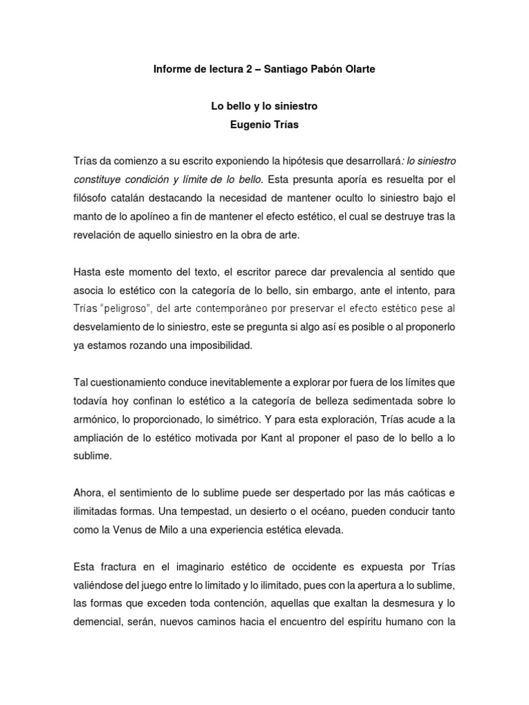 Informe De Lectura Sobre Lo Bello Y Lo Siniestro Estetica Immanuel Kant
