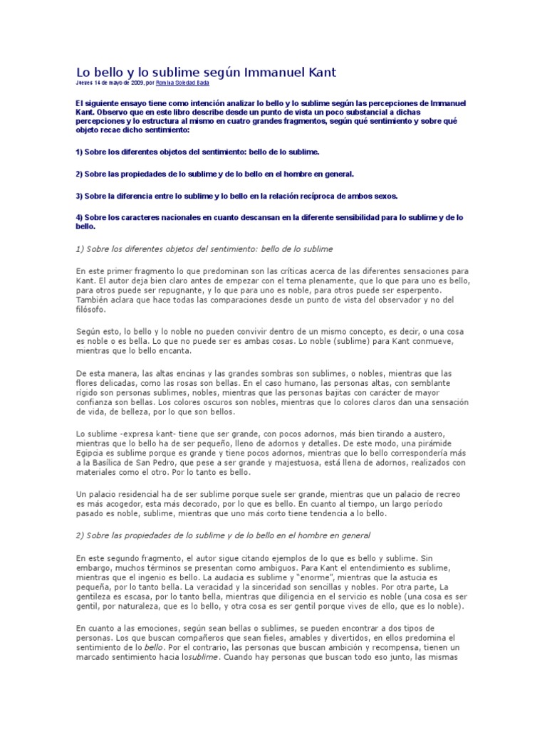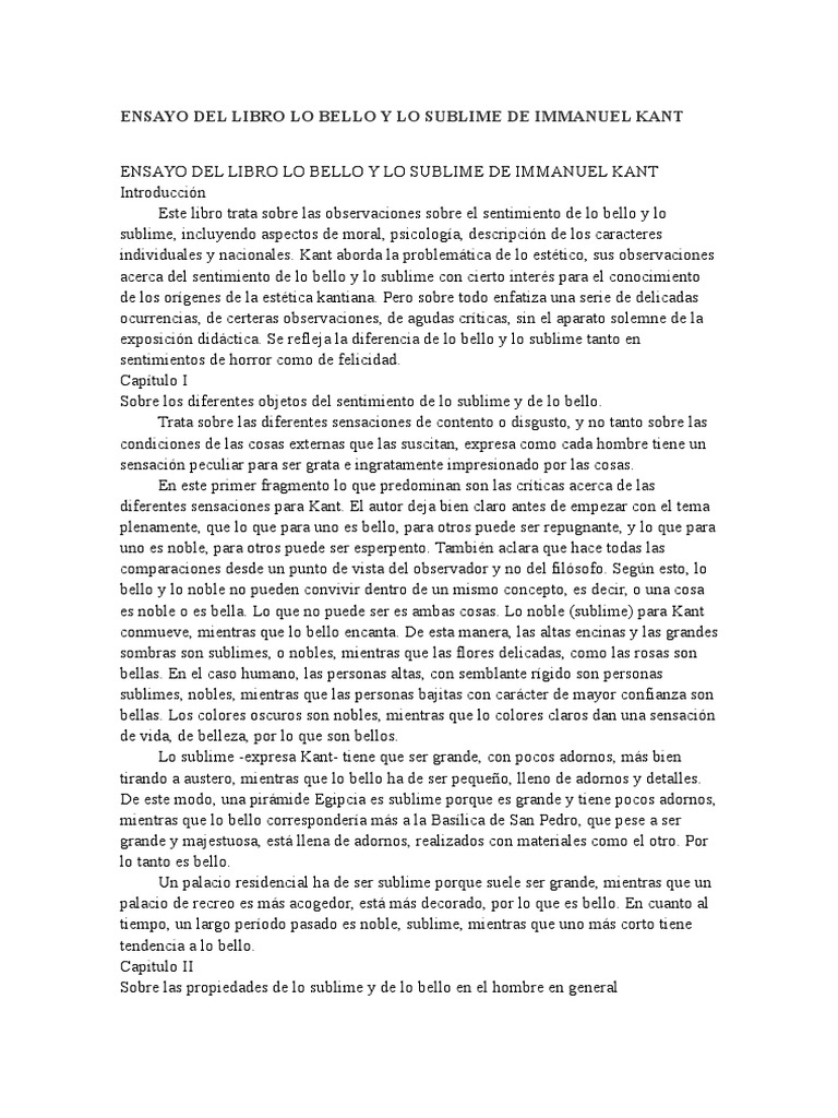 Ensayo Del Libro Lo Bello Y Lo Sublime De Immanuel Kant Immanuel Kant Belleza