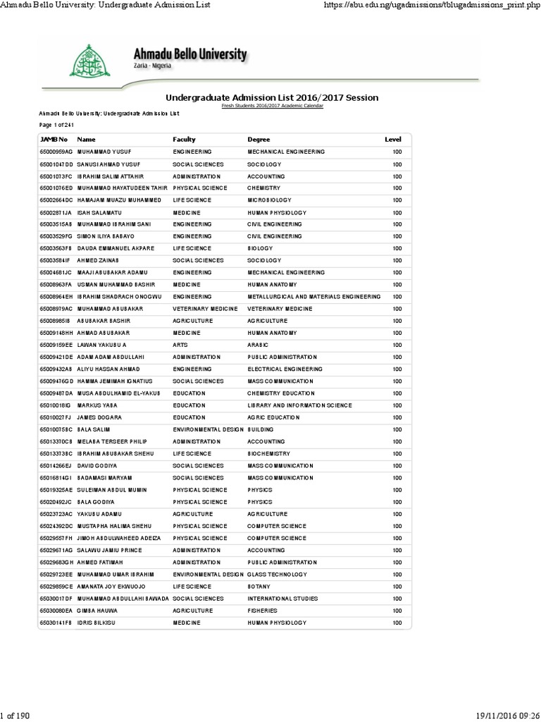 Ahmadu Bello University Undergraduate Admission List Undergraduate Education Engineering